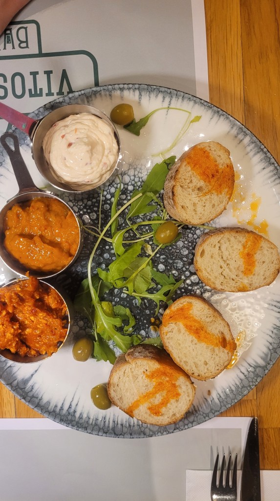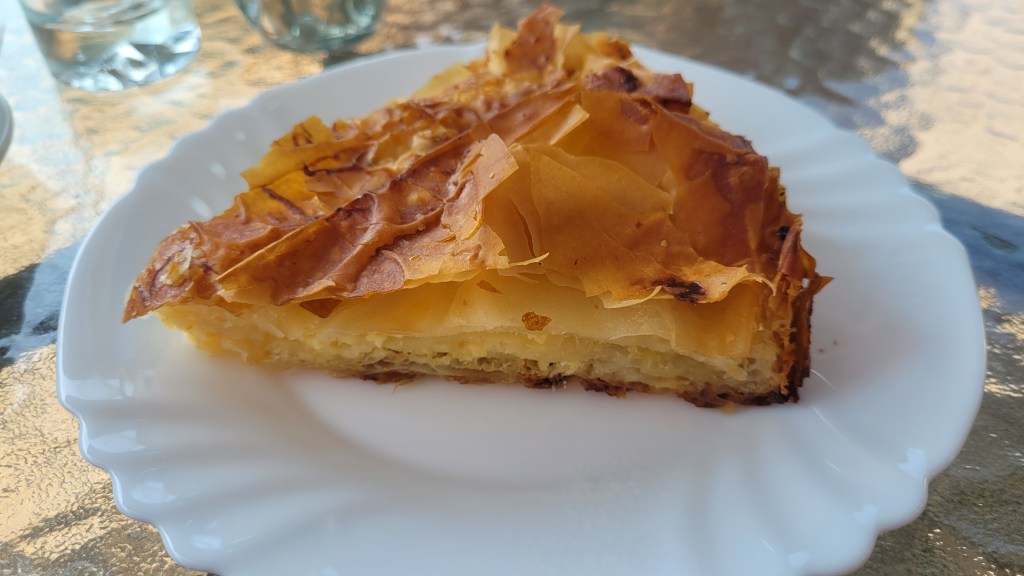 We ate shopska salad – a classic Bulgarian salad made with tomatoes, cucumbers, peppers, onions, and cheese, known for its bright colors.