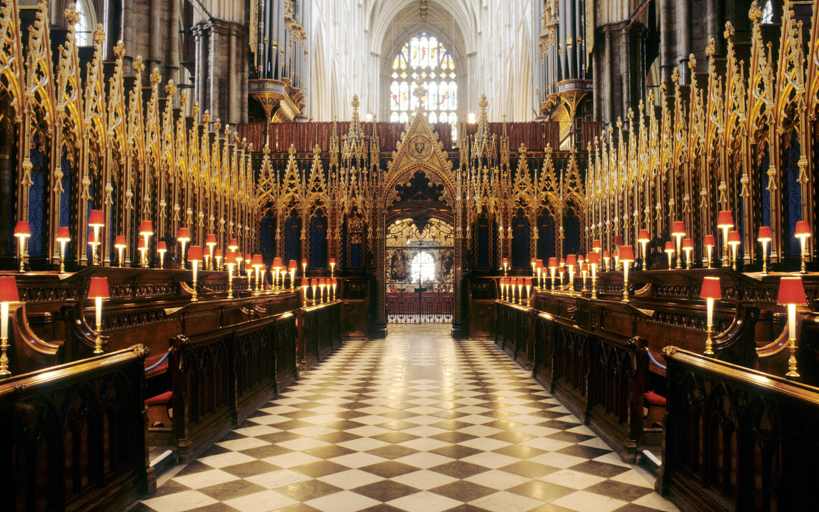 Westminster Abbey interior Choir stalls candle light gothic architecture London England UK nave Medieval architecture English