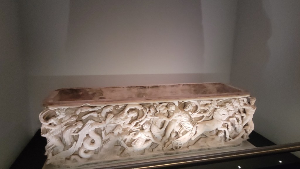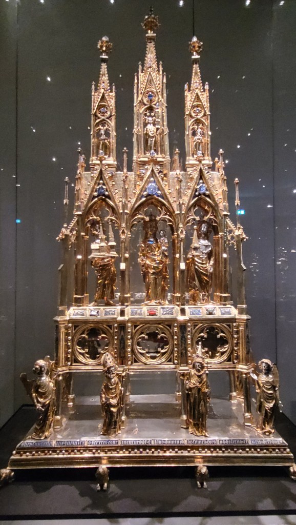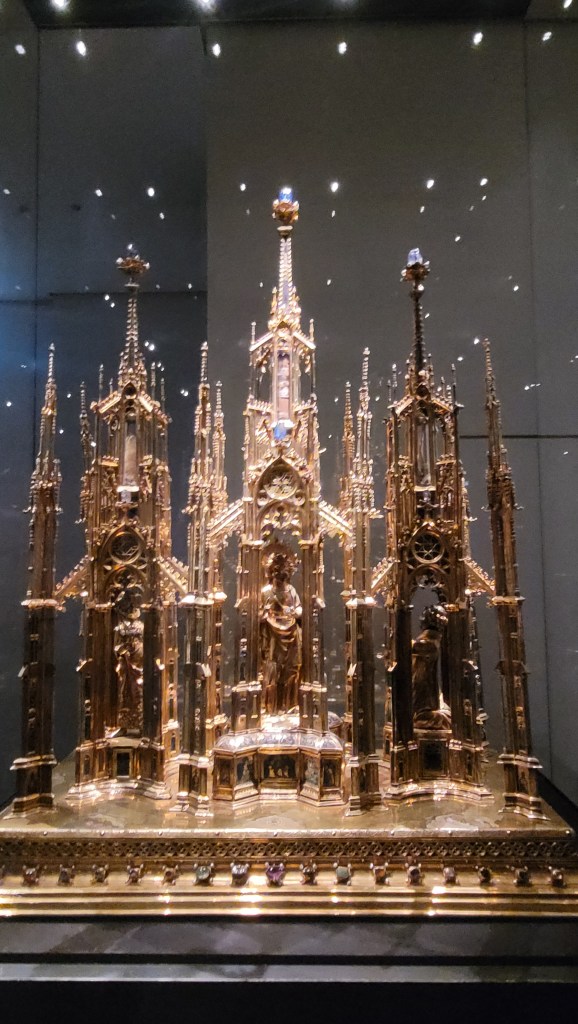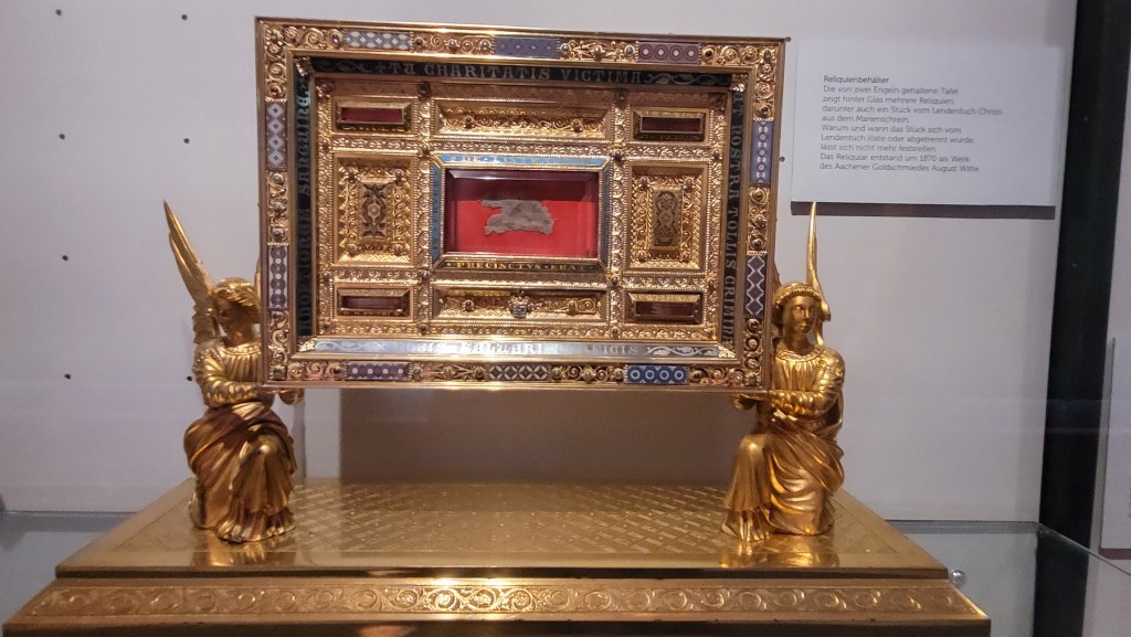 The Aachen Cathedral Treasury is a museum that houses religious and historical artifacts from the Classical, Carolingian, Ottonian, Hohenstaufen and Gothic eras. It is located next to the cathedral. I highly recommend to visit as the number of relics and golden religious artefacts and works of art is just stunning. Here just few: