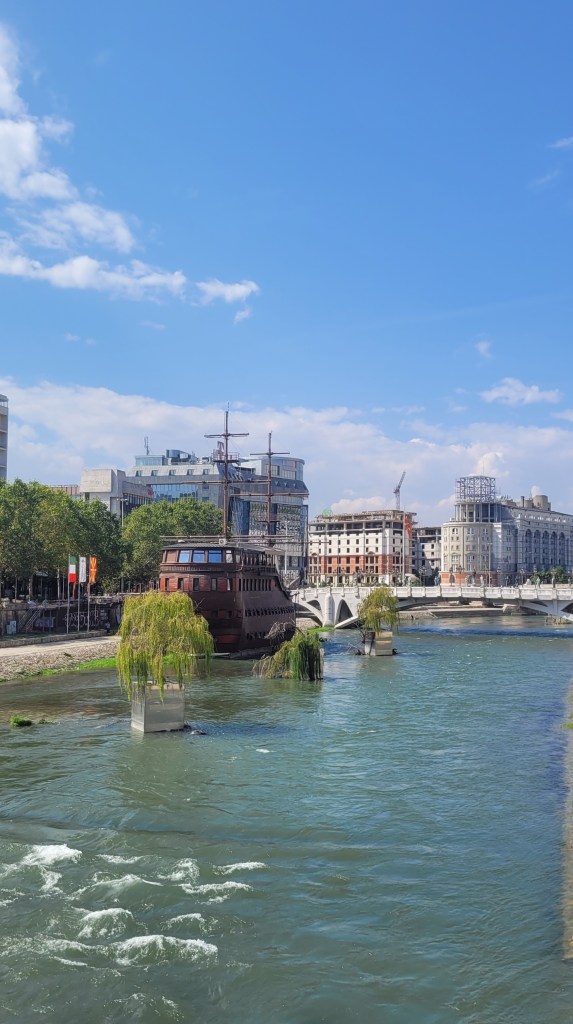 The banks of the Vardar River, which runs through the city centre, now boast new museums, government buildings and a reconstructed National Theatre. All of them have been built in a style its proponents label either neoclassical or baroque, in striking contrast to the socialist and elsewhere modernist character of most of Skopje.