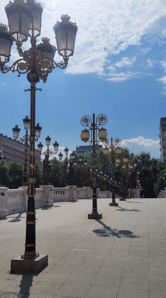 Then there is this kitchy bridge, one of many actually, over the river Vardar, with many lamps and statues, again.
