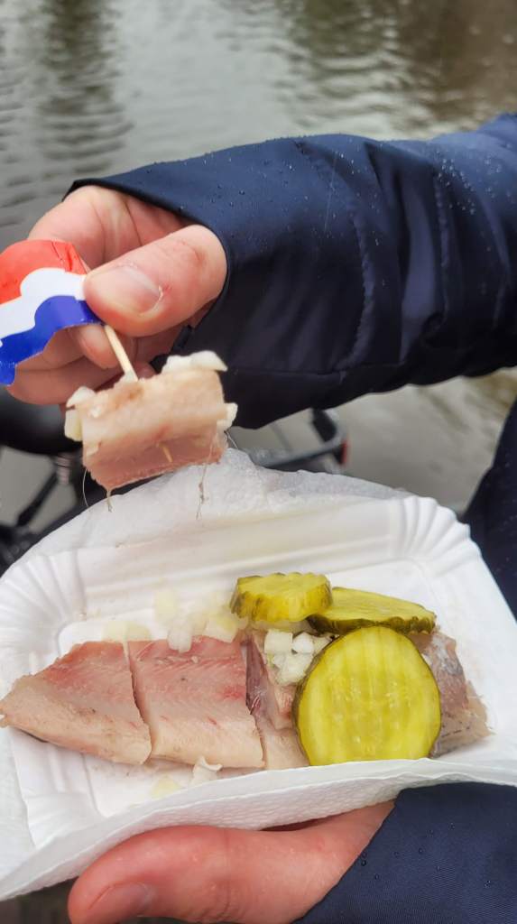 What I am trying to depict here is the way the Dutch traditionally eat herring. Holding on to its tail and eating it in a few bites. Usually this dish is served with chopped pieces of raw onion and sometimes pickles. Most people go for a round of haringhappen at a local stall.