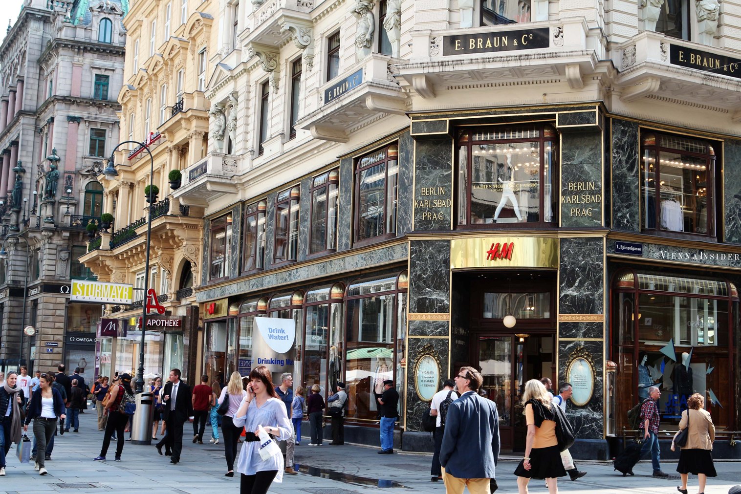 When you walk further in Graben street you can see the residential building called Ankerhaus erected between 1894 by Otto Wagner (art nouveau architect), presumably for himself. Its name owes to the fact that the previous building had been purchased by the eponymous insurance firm Der Anker.