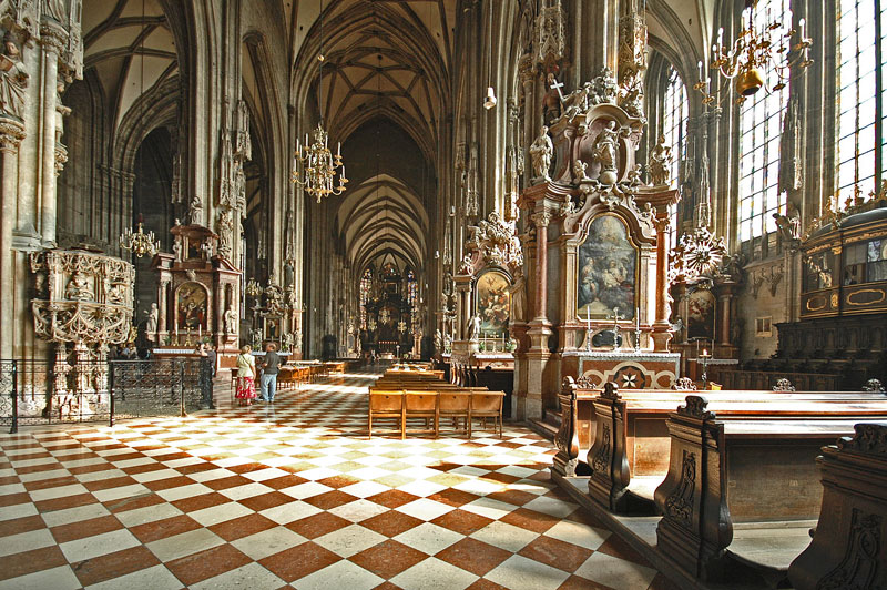 St. Stephen’s Cathedral seen today in the Stephansplatz is a gothic church from 14th century. The most important religious building in Vienna, St. Stephen’s Cathedral has borne witness to many important events in Habsburg and Austrian history and has, with its multi-coloured tile roof, become one of the city’s most recognizable symbols. You can spot the two-headed eagle on the roof (because the Empire spreads to the East and West and because the political power comes from God and is represented by an Emperor).