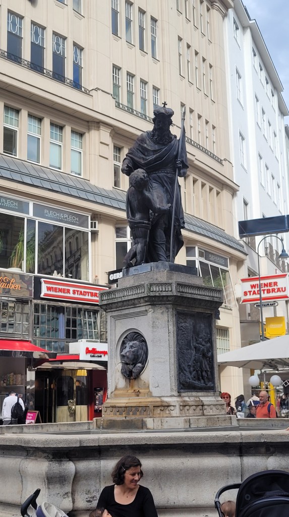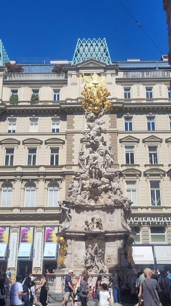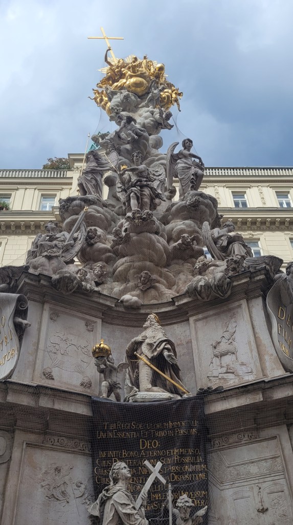 Just in front, there are two monuments: the Pestsäule constructed by Emperor Leopold I following the Great Plague of Vienna and Leopoldsbrunnen. This translates as the well of Saint Leopold.