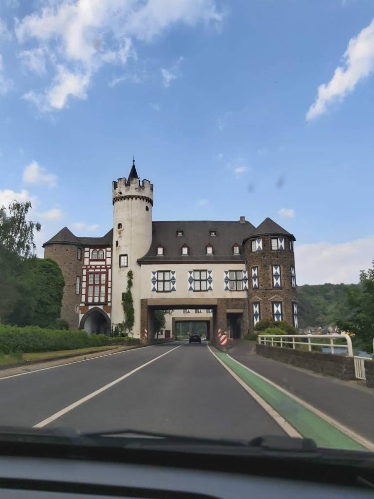 On our right is the river Moselle, on the left the vineyards scenery on the cliffs and we are driving right through the castle. The fairytale!