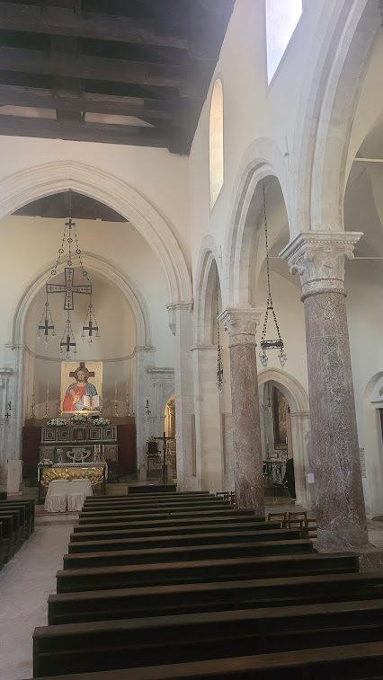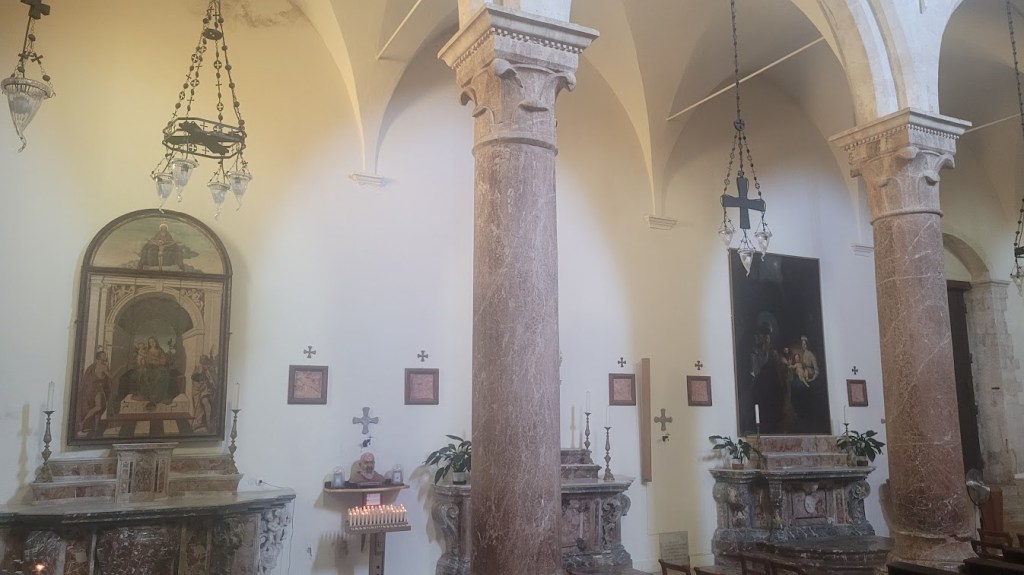 Continuing the streets further more, you will arrive to the piazza with the Church of Saint Catherine of Alexandria. The church of Saint Catherine “intra muros” was built on the top of the ruins of the Roman Theater (Odeon), partially destroying its orchestra and its scene which consisted of the southern colonnade of a Greek temple, some say dedicated to Aphrodite. The interior of the church is a single nave, with an elegant wooden-beam trussed ceiling. On the main altar you can see an imposing painting depicting saint Catherine’s martyrdom, attributed to the Sicilian painter Jacopo Vignerio (XVI century).