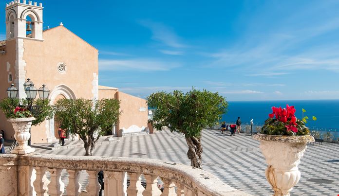 Then you arrive to Piazza IX Aprile – located right in the center of Corso Umberto. The square is known for the breathtaking view of the azure Ionian Sea and of the Mount Etna. Lined with pricey cafés and brimming with visitors and caricature artists, it’s the best place to sit back with a cappuccino and enjoy the relaxed resorty ambience of Taormina.The square was named after the 9th of April, 1860, when mass in the Taormina cathedral down the street was interrupted to announce that Garibaldi had landed at Marsala (on the far side of the island) to begin his conquest of Sicily that made it part of Italy. Actually, the news proves false. In fact Garibaldi landed at Marsala exactly one month later, on 9 May 1860. However, the inhabitants of Taormina wanted to recall that date dedicating the most beautiful square.