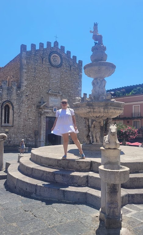Just opposite stands the called Quattro Fontane. The fountain was built in 17th century in the Baroque style, and it is called 4 fountains because there are 4 small columns supporting basins which are located at the corners of the central basin; mythological ponies overlook the basins and fountain water flows out of their mouths. Above the two central basins, there is the Minotaur, half human and half cow, which is the emblem of the city of Taormina. Depicted in the female version, it has two arms holding an orb and scepter, symbols of power.