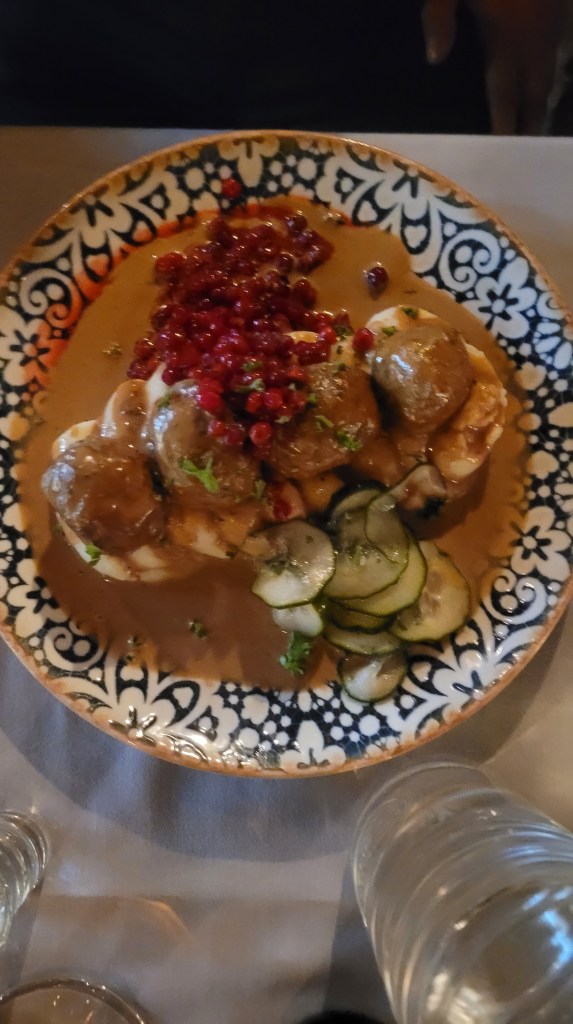 The dinner was Swedish meat balls! Of course 🙂 They were a bit too sour for my taste and tasted like wild animal. Perhaps I had moose?