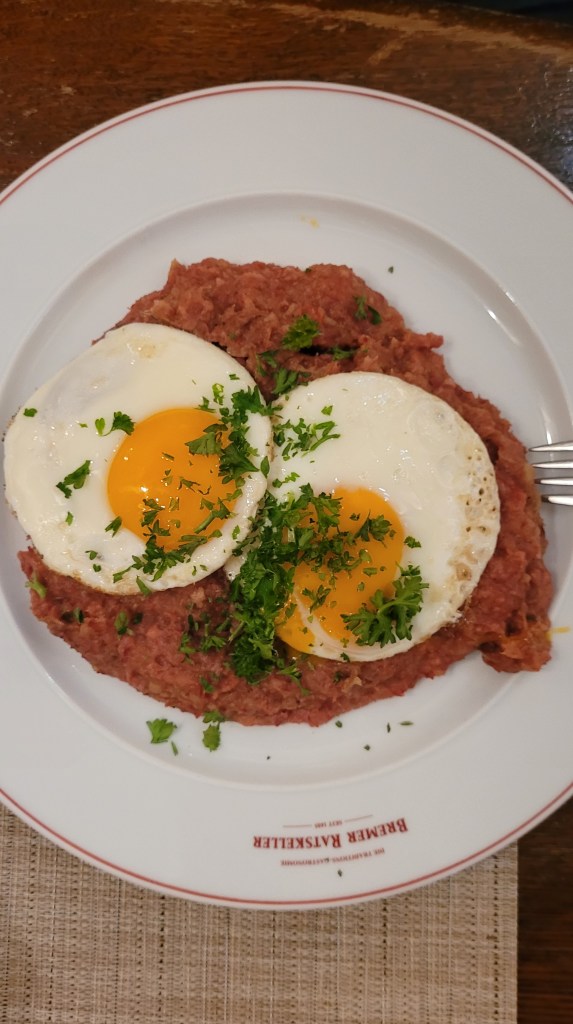 Visiting Bremen you can not help but experience some restaurants with traditional German dishes. We ate home made Labskaus: consisting of salted meat or corned beef, potatoes, onion, pickled herring and fried eggs, served with some pickled radish. Nothing fancy but very local.