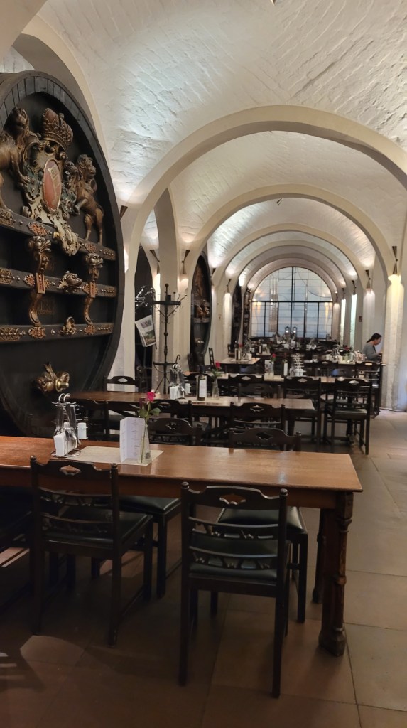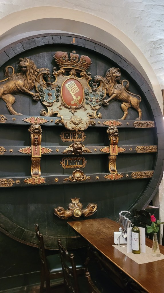 Just next to it is a Bremen Ratskeller – a restaurant in centuries-old cellar with vaulted ceilings. This looked amazing to be explored. Note the old emblem: the keys of Saint Peter with a labyrinth/ path to find a way to God. The emblem is one of the motivfs of this beautiful medieval city.