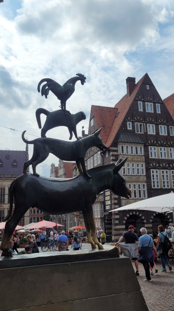 Koki the rooster, Lupo the dog, Burlón the cat and Tonto the donkey. And me. Starring in Brother Grimm’s story in Bremen. 🙂 The story tells they formed a band playing guitar, drums, trumpet and saxophone with the aim of winning a contest in the city of Bremen.