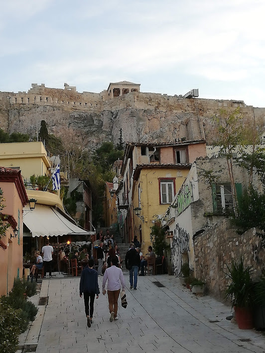 Strolling down, I sat for a beer. The sky cleared, the November sun hit, and my view of the Acropolis brought me into deep thinking. The city was named after the goddess Athena, protector of Athens, after she gifted the olive tree to its people. In mythology, this was in a contest with Poseidon, who offered a saltwater spring. Greek Gods often fight and it is never a good sign when they go down among us, the common people.