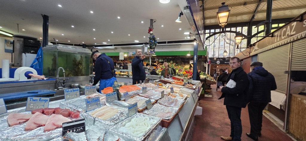 A little further on, we stepped into the Marché couvert Saint-Quentin, one of Paris’s most beautiful 19th-century covered markets. Built in 1866 in the elegant Baltard style of iron, glass, and brick, it is famous not only for its architecture but also for the vibrant mix of cultures and flavors gathered under one roof, from classic French produce to international delicacies. It felt like entering a living piece of Parisian daily life, where the city’s history and its appetite meet in the most natural way.