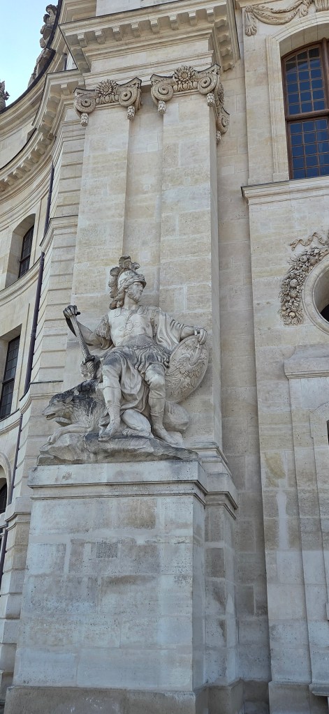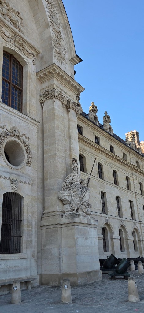 On the façade of Les Invalides, Mars and Minerva stand as stone guardians of war and wisdom.