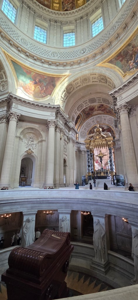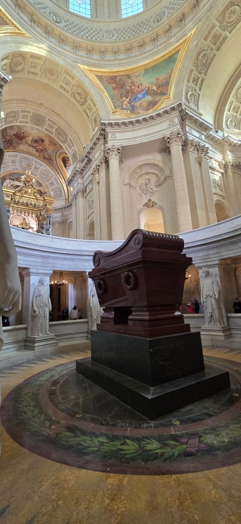 Napoleon’s tomb is designed with deliberate symbolism: the sarcophagus rests at the center of a circular crypt so that every visitor is forced to look down upon it from above before descending and then up toward it again from below. You are never equal to him.