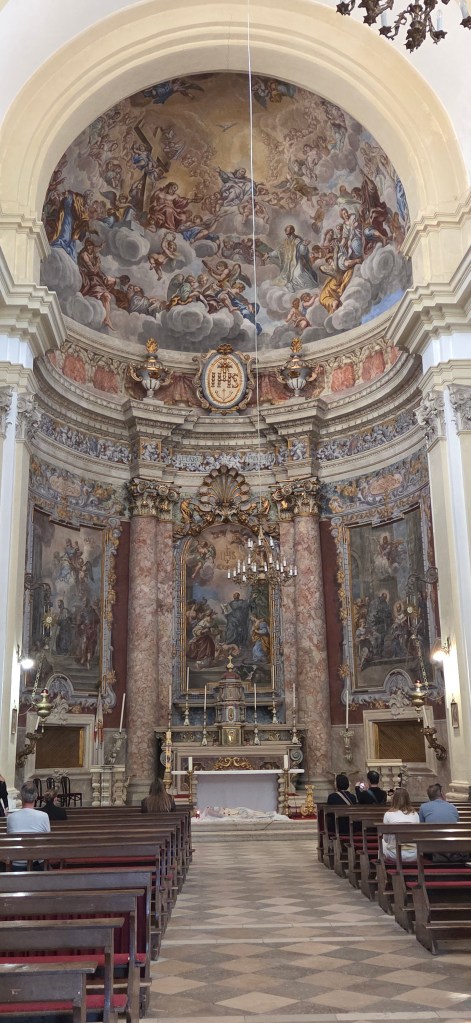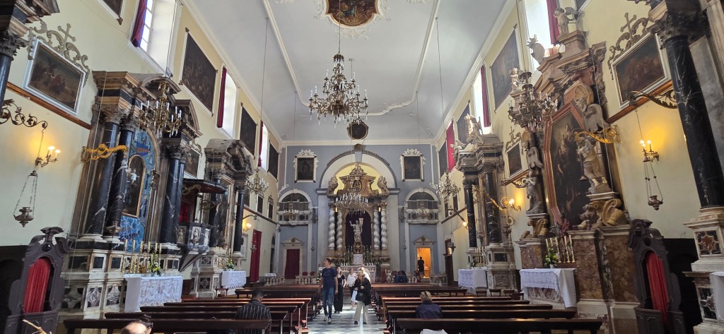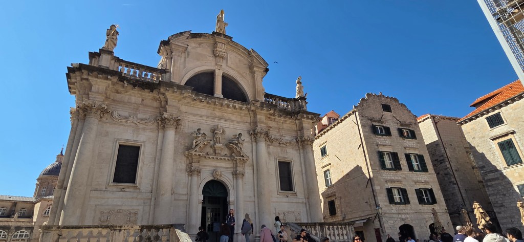 Towards the quieter side of Dubrovnik, we reached another beautiful church façade rising calmly against the sky, almost glowing in the late afternoon light. This was the Jesuit Church of St. Ignatius (Crkva sv. Ignacija). Inside, it is known for beautiful frescoes and for representing the more scholarly, spiritual side of Dubrovnik’s later Baroque period.