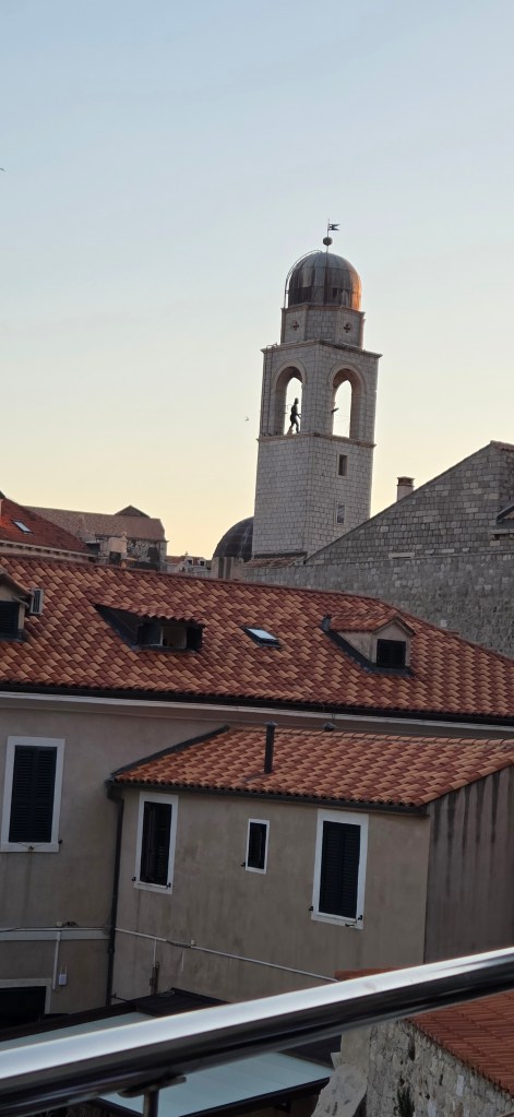 From the restaurant terrace, we had a view toward the church bells, and at the right moment, Maro and Baro rang those bells, striking the famous clock tower bells above the city.